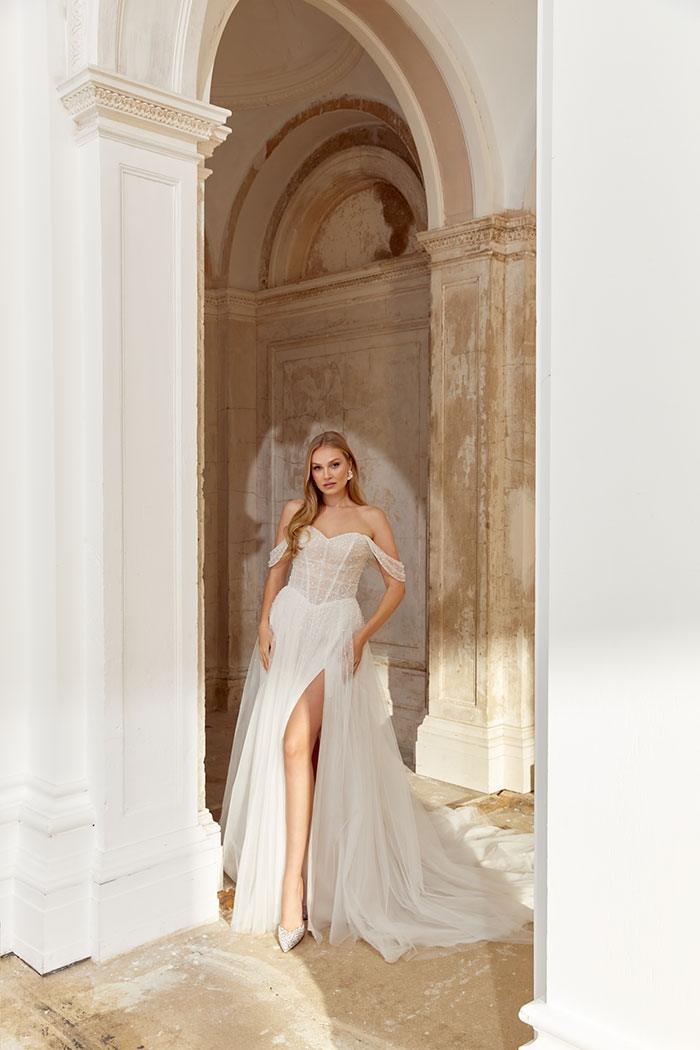 Questo abito da sposa realizzato con un fantastico pizzo ed un fantastico spacco è una delle novità dell’Anteprima della Collezione 2026 di Jastin Alexander collezione Sincerity.