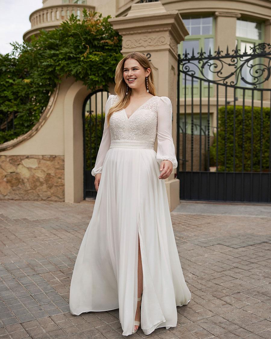 Romantico abito da sposa FAVRIAN realizzato in pizzo. Con scollo, schiena scoperta, questo esclusivo look Aire è perfetto per te.