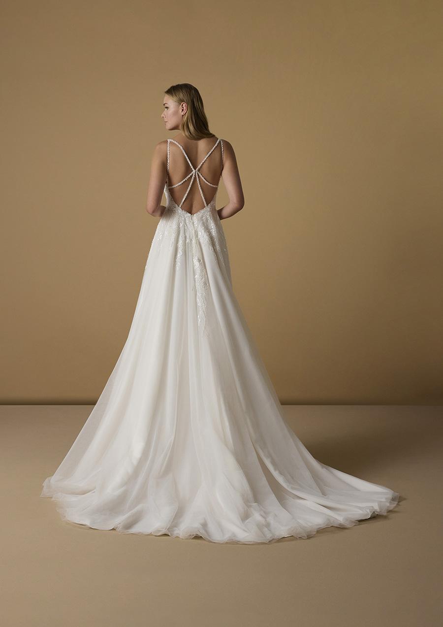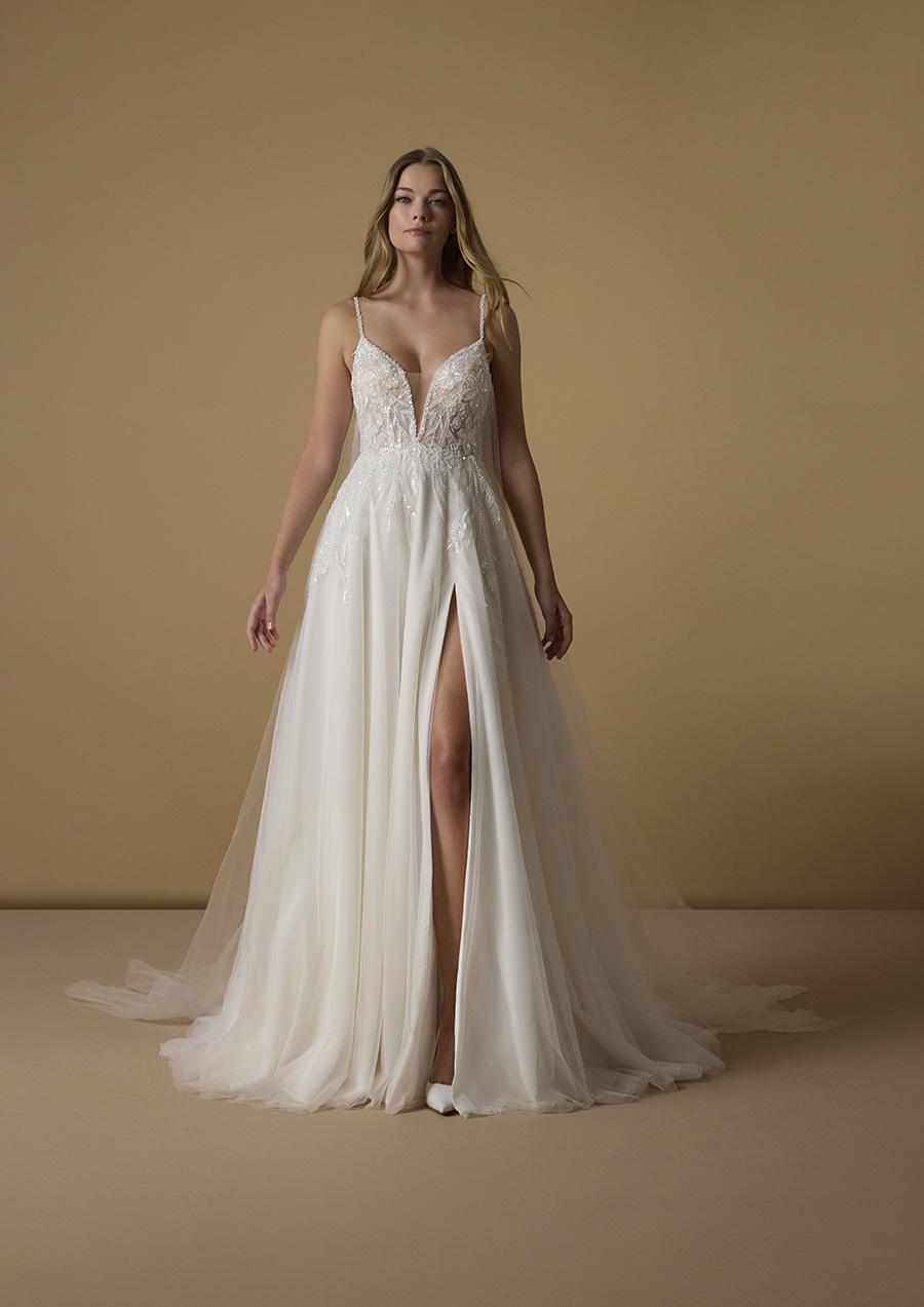 Abito da sposa modello MELI presentato dal brand italiano NICOLE MILANO abito in pizzo e strass con spacco laterale