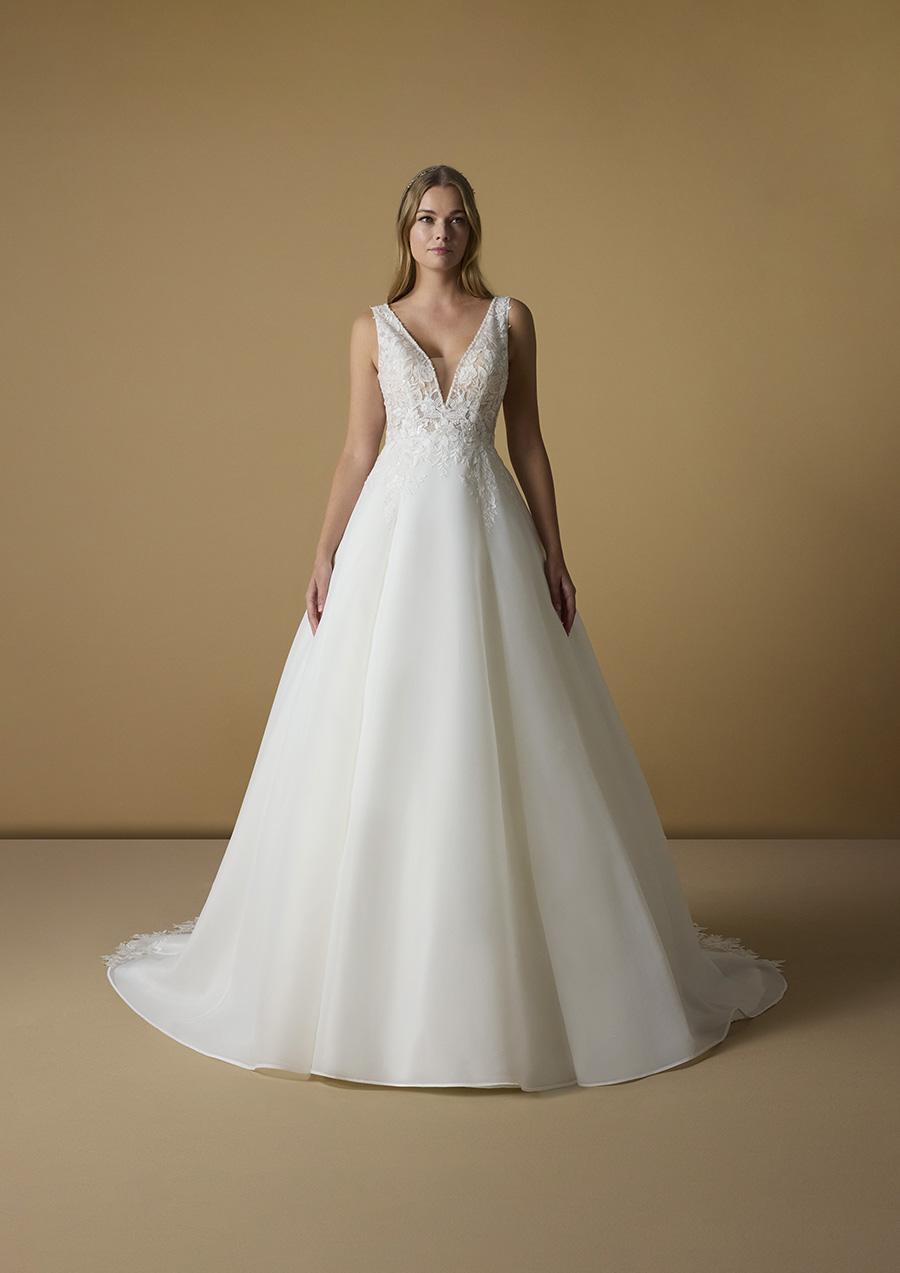 Abito da sposa modello NALDA presentato dal brand italiano NICOLE MILANO modello principessa con scollo a V