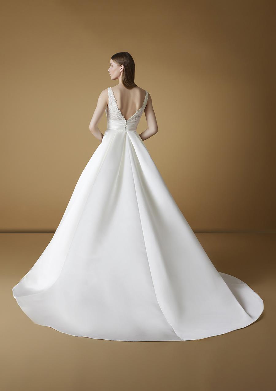 Abito da sposa modello THAELIA presentato dal brand italiano NICOLE MILANO modello a sirena con sopragonna staccabile.