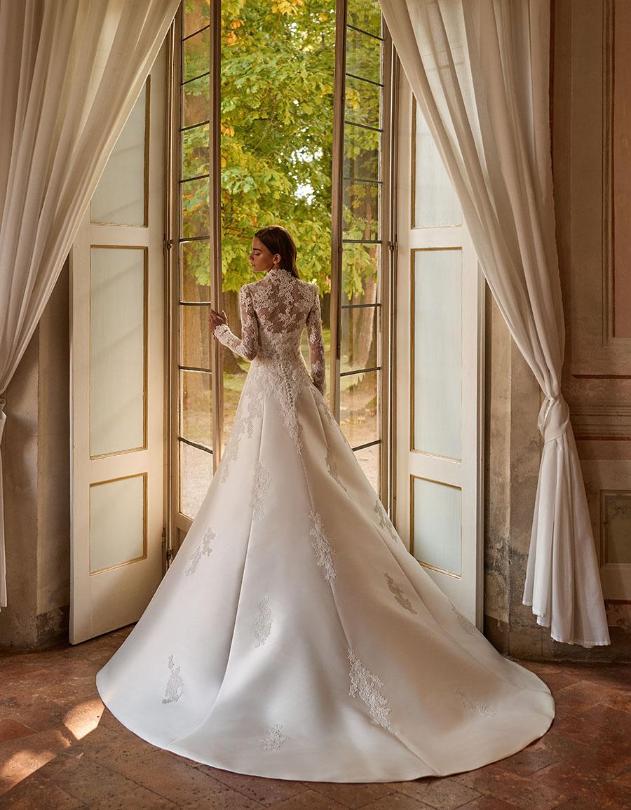 L’abito da sposa CATHI di Alberto Palatchi modello principessa sublimato dalla lucentezza del tessuto fa parte della collezione Romantic.