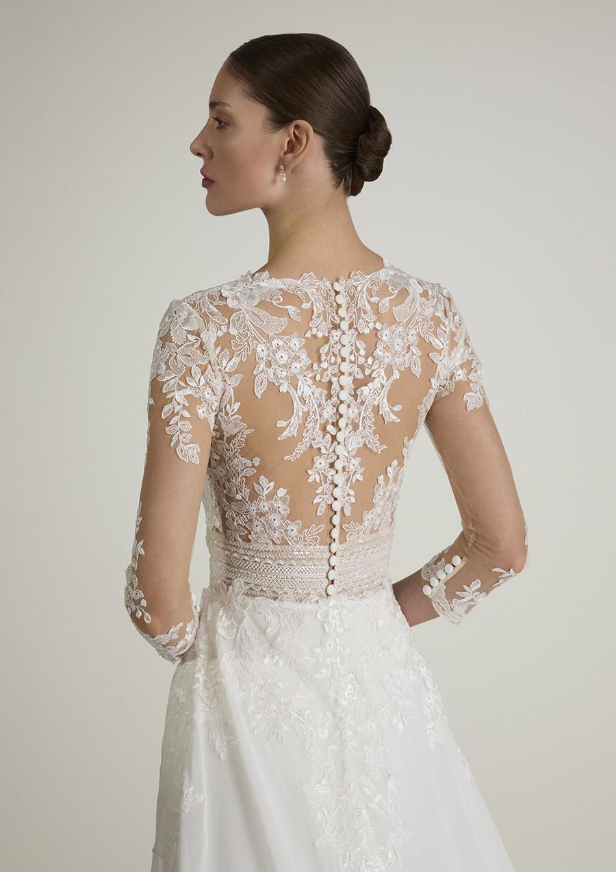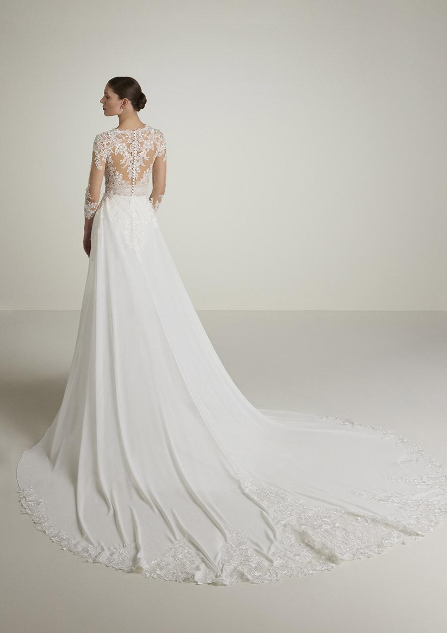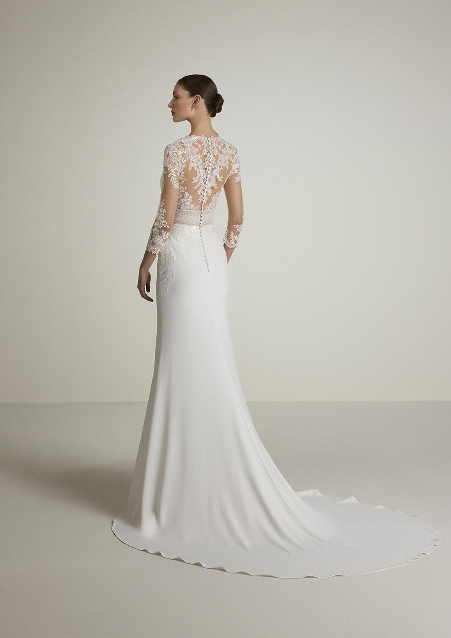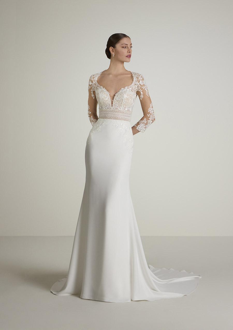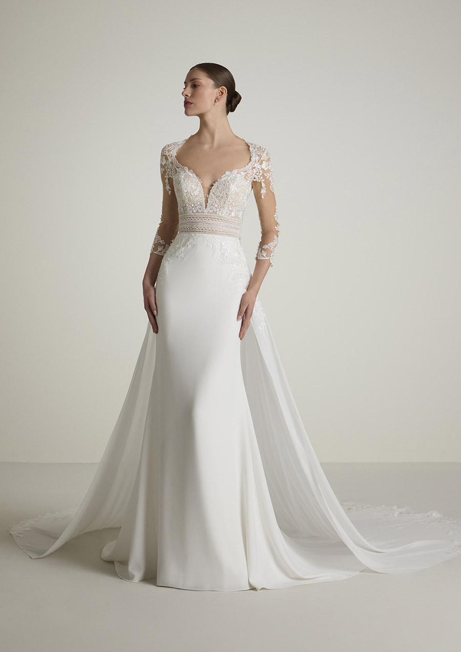 L’abito da sposa DIORIA collezione 2025 del brand spagnolo ST PATRICK gruppo PRONOVIAS, modello a sirena con pizzi francesi ricercati ed unici