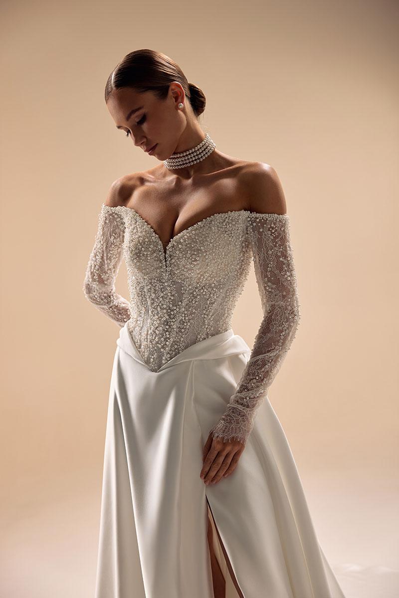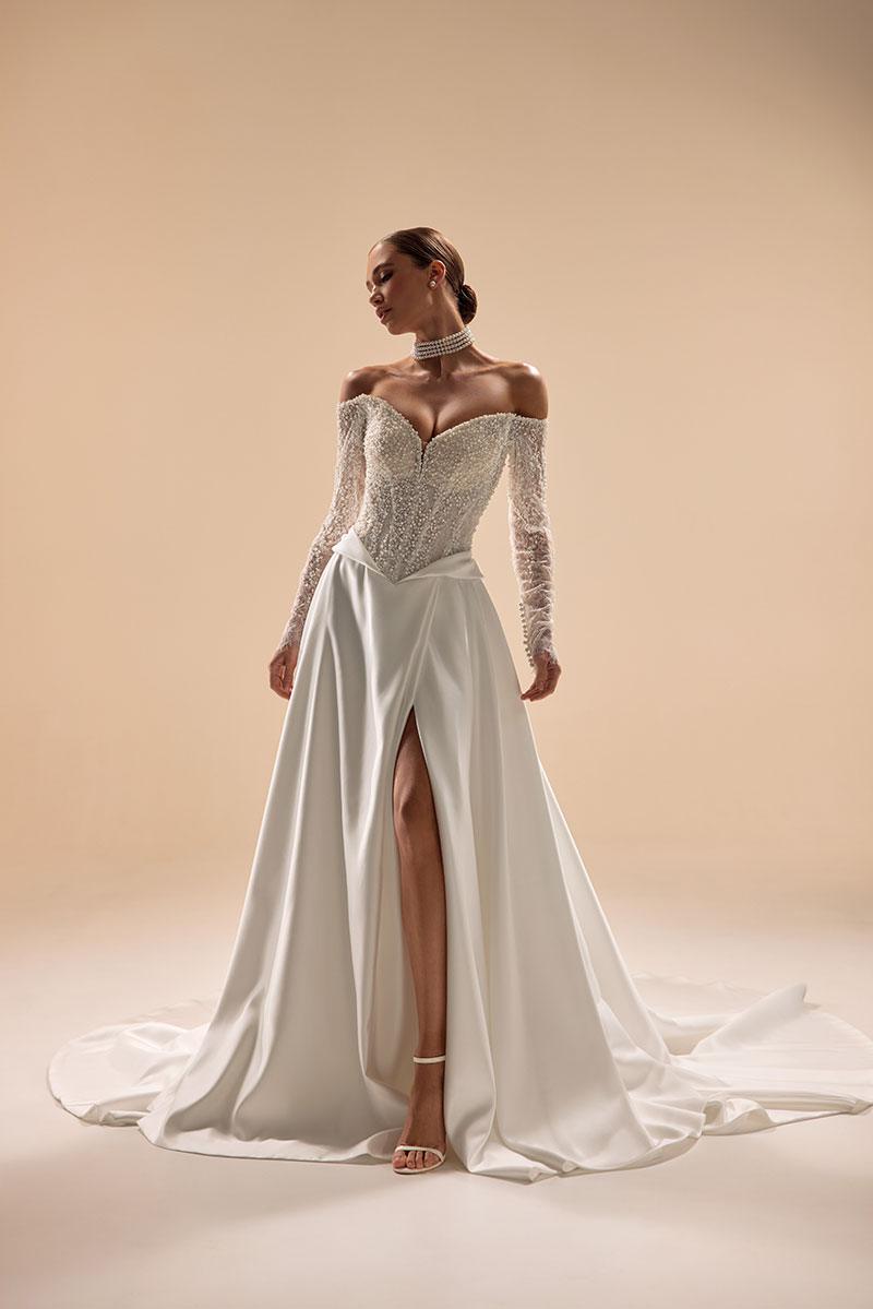 Edelweiss è un abito da sposa raffinato con corsetto in pizzo decorato con paillettes e perline che avvolge delicatamente la vita e il petto. La parte inferiore in raso liscio. La scelta perfetta per due look lussuosi.