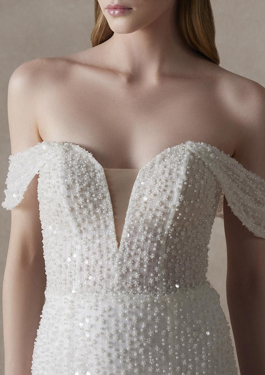 The SUHA wedding dress from the NICOLE COUTURE 2025 line, a mermaid model in lace embellished with precious crystals.