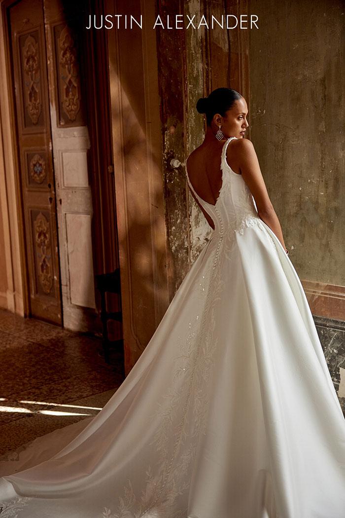 Questo abito da sposa in mikado morbido impreziosito da un fantastico pizzo ricamato è una delle novità dell’Anteprima della Collezione 2026 di Justin Alexander.