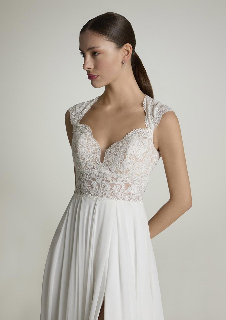 L’abito da sposa TENDER collezione 2025 del brand spagnolo ST PATRICK gruppo PRONOVIAS, modello impreziosito dal fantastico pizzo ed uno particolare scollo.