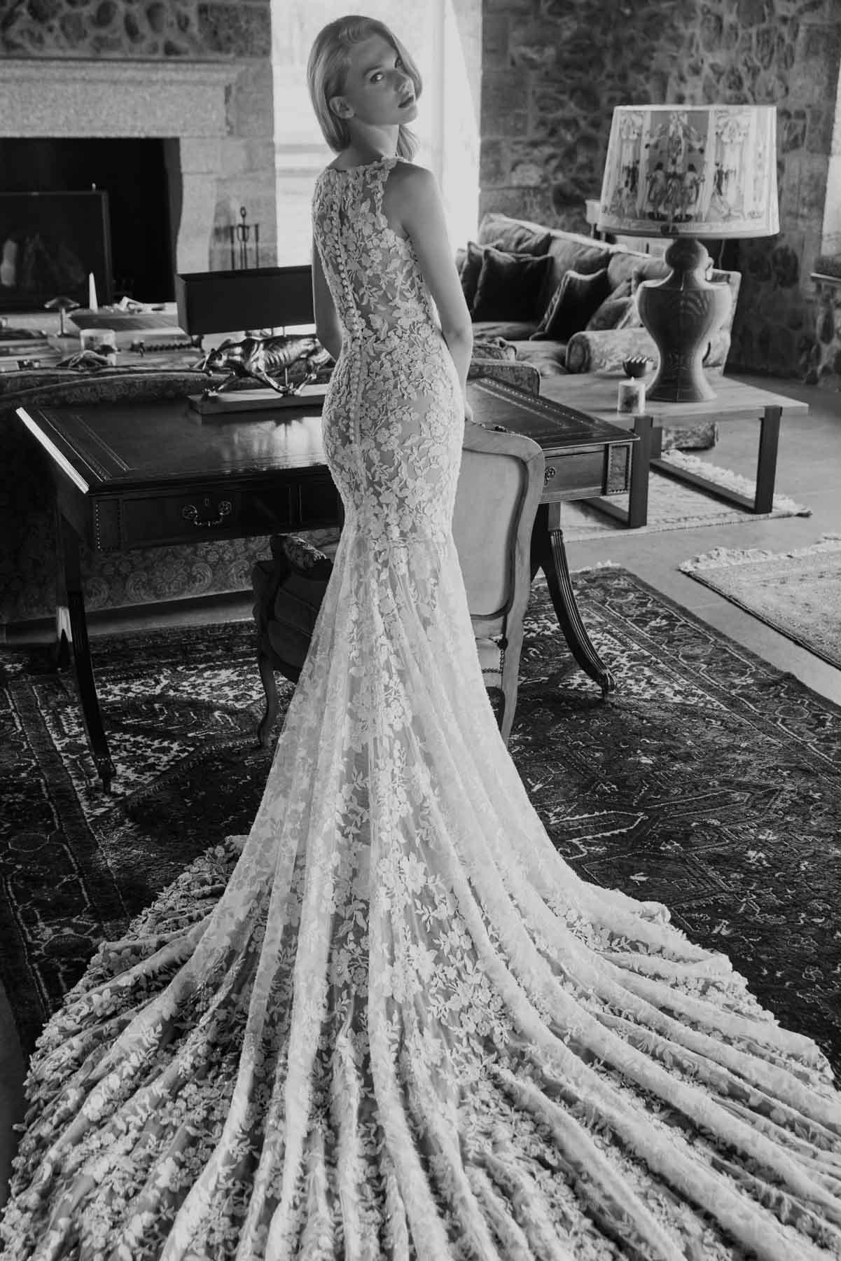 Abito a sirena dallo stile moderno realizzato in crêpe dalia con una sorprendente parte posteriore trasparente realizzata con applicazioni di filo lucido ricamato.