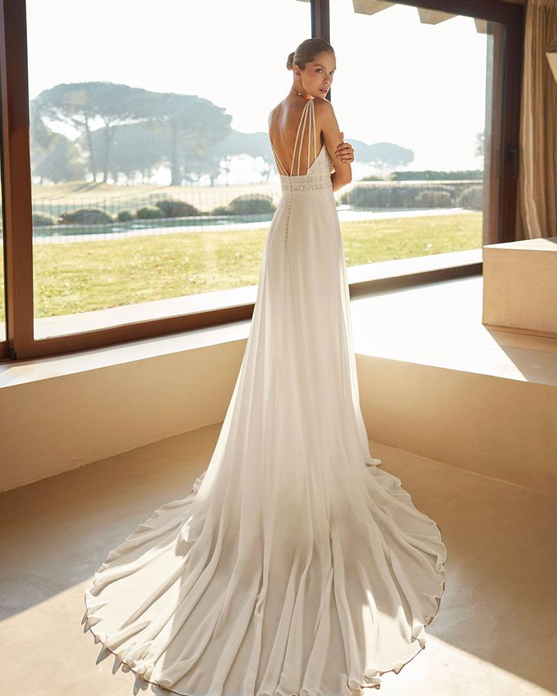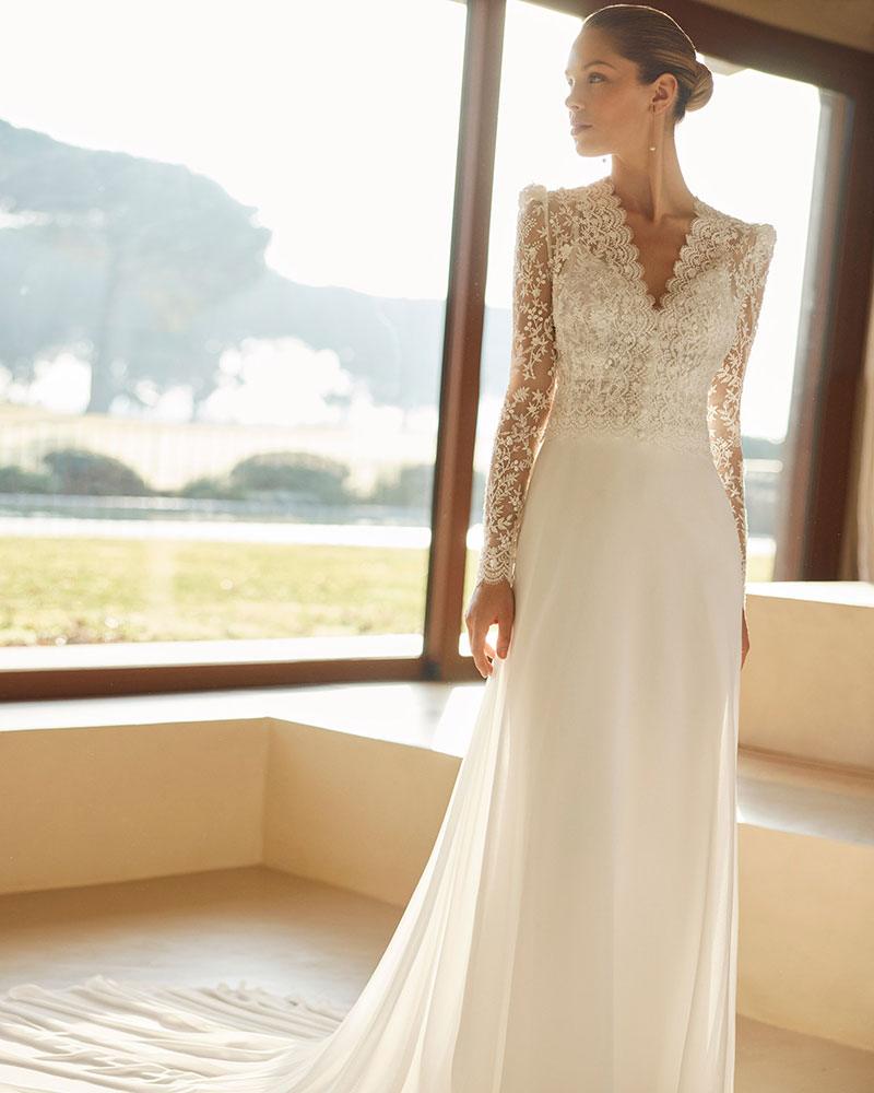 Abito da sposa bellissimo del Brand AIRE BARCELONA ROSA CLARÀ modello ZAZURK interamente realizzato in pizzo con collo alto.